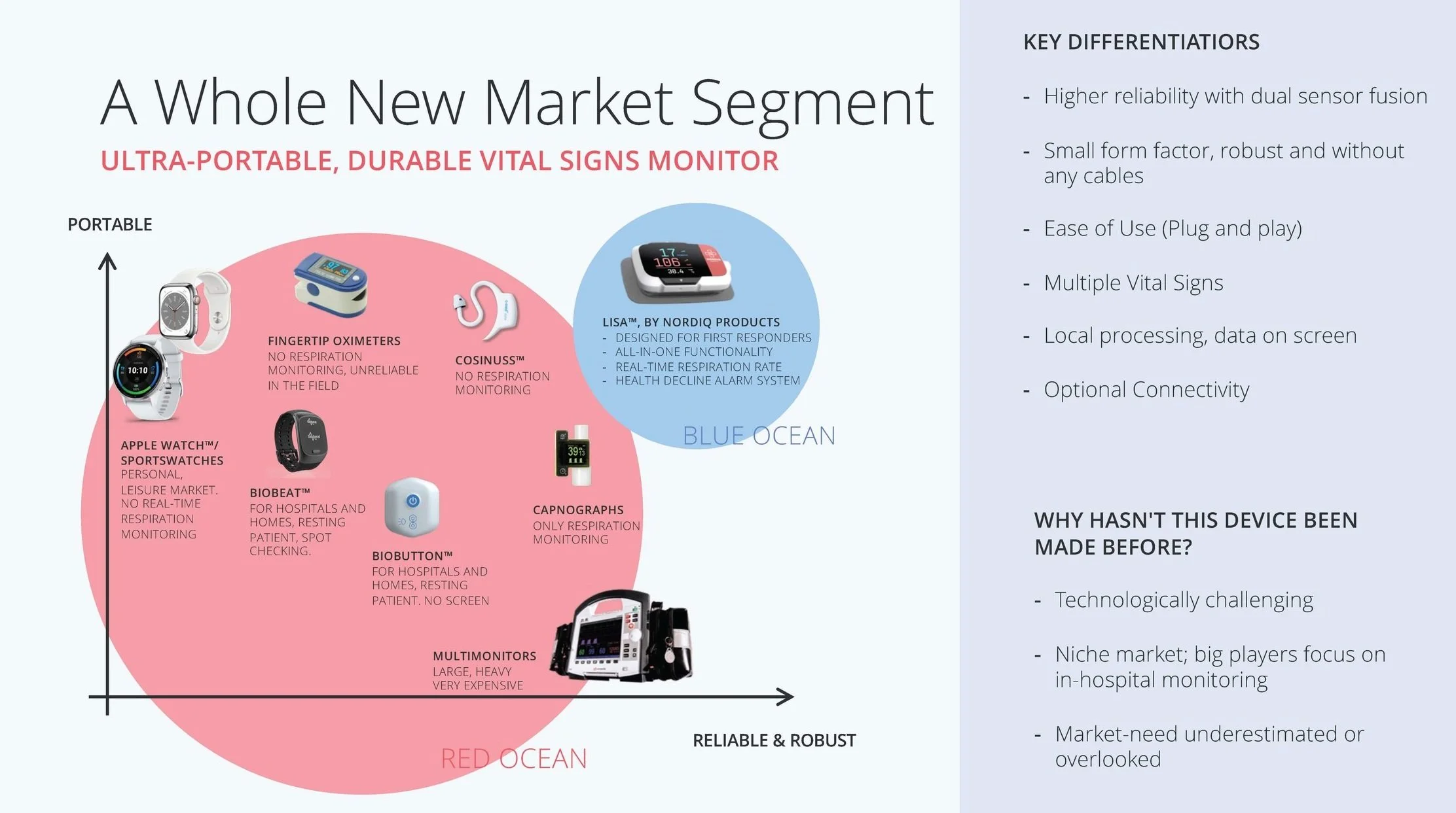 Ingen andre pasientmonitorer kan beskrives som “Robust, kompakt, uten bevegelige deler, og uavhengig av eksterne skjermer. Perfekt for militære og sivile redningsoperasjoner”.Fornuftig kapitalbruk og et smidig og effektivt team